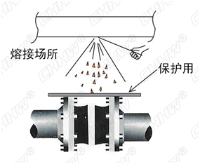 五、安裝完成后,如在產品附近,進行焊接或焊割的話,請用板材或布料蓋住產品以免濺到火花。如有焊接或焊割引起的傳熱危險,請采取把撓性單球體橡膠接頭從管道上坼下來等應對措施。(如下圖)