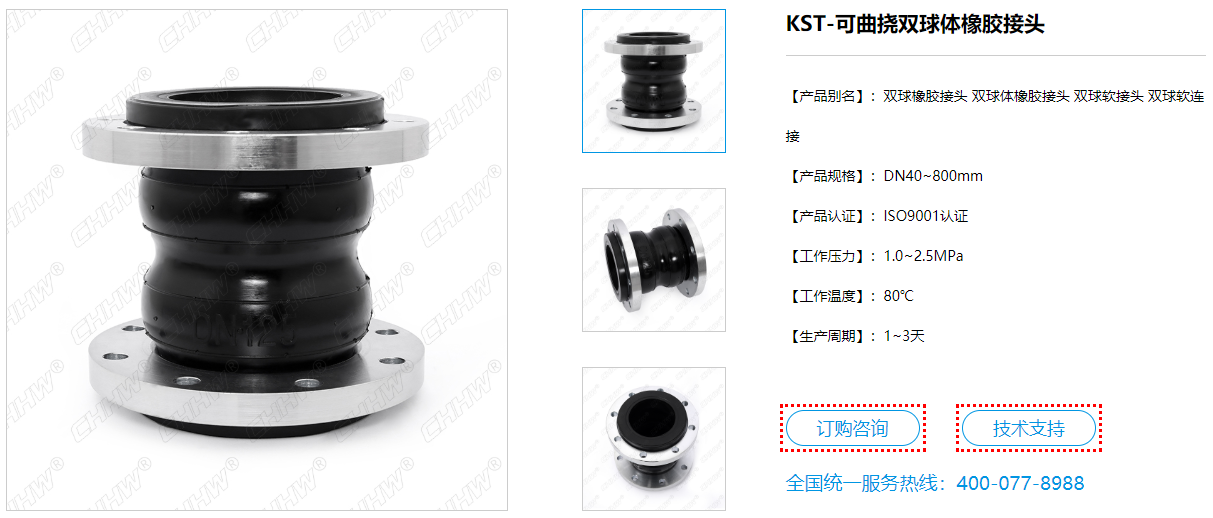 KST-可曲撓雙球體軟膠管接頭若采用拱形或高弧度軟膠管接頭,由于螺栓六角處難以通過法蘭盤孔,因此必須選用雙頭螺栓,并盡量減少球體端部螺紋突出,以免由于球體受壓膨脹而撞傷導致軟膠管早期損壞。可曲撓橡膠軟接頭運用在離心水泵進出口時,應坐落水泉一側與水泉之間應安裝金屬變徑接頭且安裝在變徑的大口徑出處。