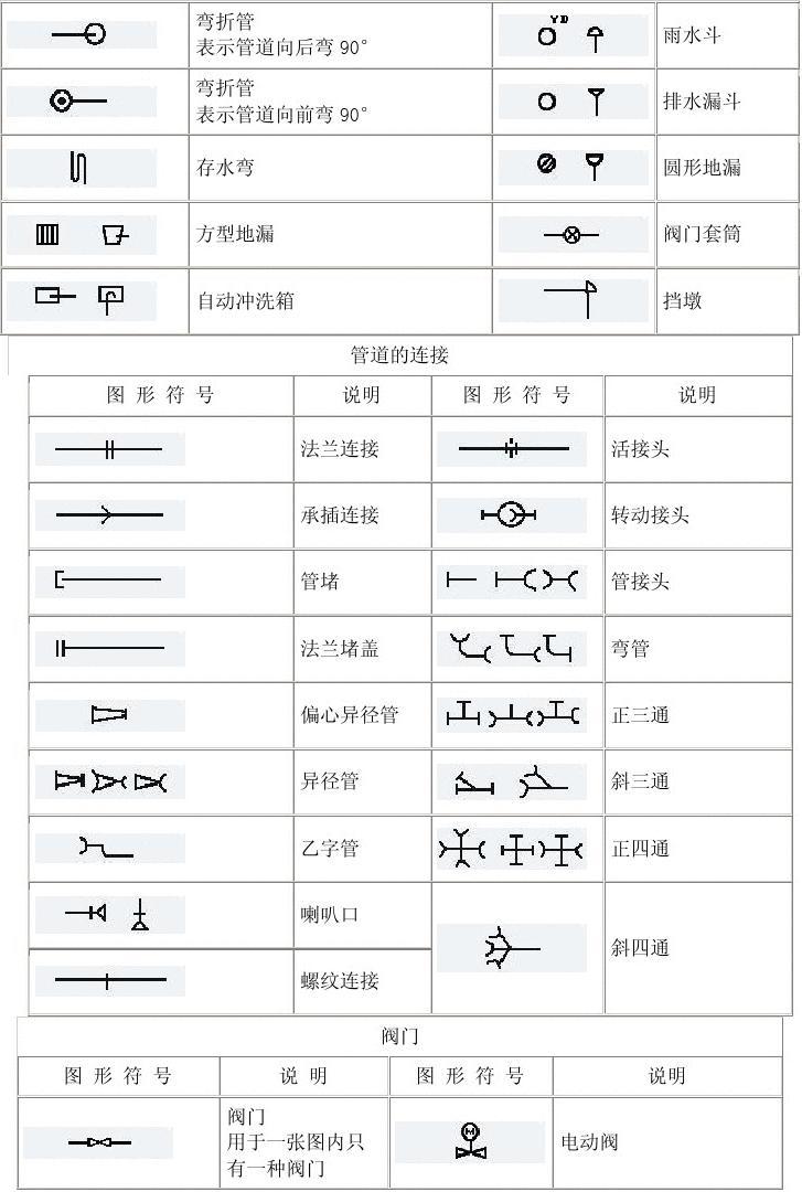 彎折管 表示管道向后彎 90° 彎折管 表示管道向前彎 90° 存水彎 方型地漏 自動(dòng)沖洗箱 管道的連接 圖 形 符 號 說明 法蘭連接 承插連接 管堵 法蘭堵蓋 偏心異徑管 異徑管 乙字管 喇叭口 圖 形 符 號