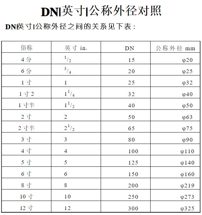5、當設計均用公稱直徑DN表示管徑時,應有公稱直徑DN與相應產品規格對照表(參考下圖)。